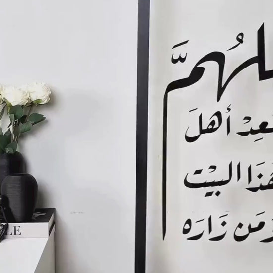 منسوجة بخط عربي بارز يعكس جمالية الحروف ودقة التصميم، ومحاطة بإطار أسود أنيق يضيف عمقًا بصريًا للمكان